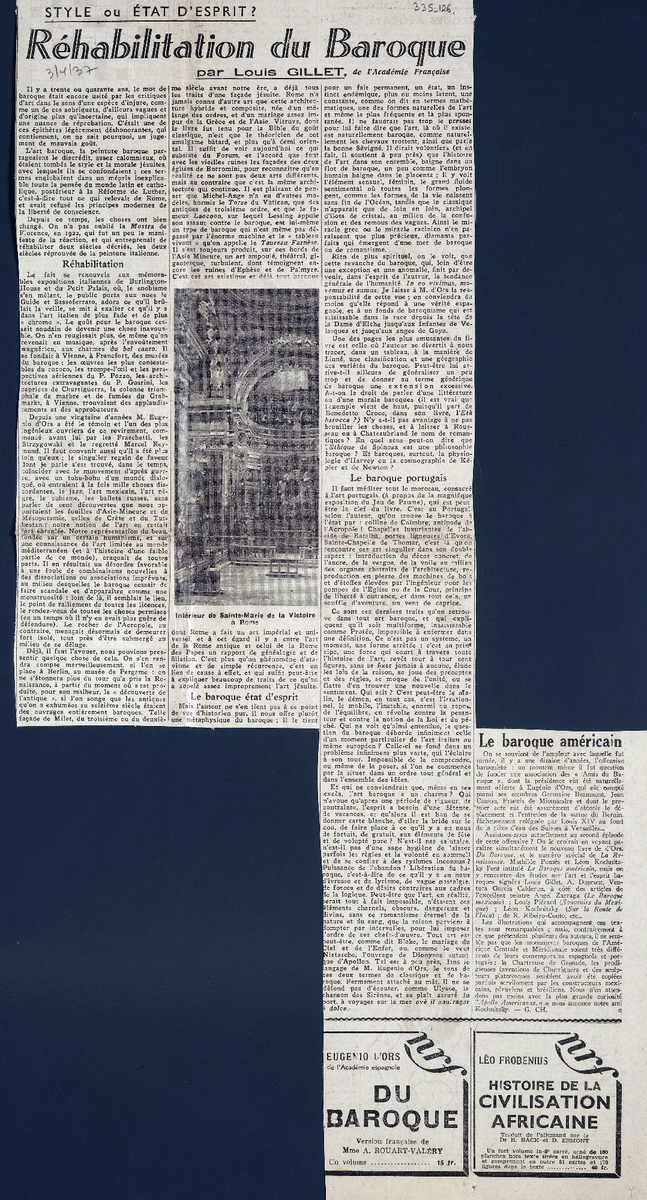 Απόκομμα, έντυπο, στα γαλλικά, χαρτί, διπλής όψης, 44×28,5 εκ., όπου δημοσιεύεται άρθρο του Γάλλου ιστορικού τέχνης L. Gillet. Το απόσπασμα εικονογραφείται. Κάτω από τον τίτλο, επιγραφή με τα στοιχεία έκδοσης. Στο ίδιο απόκομμα: G. Ch “Le baroque américain”.