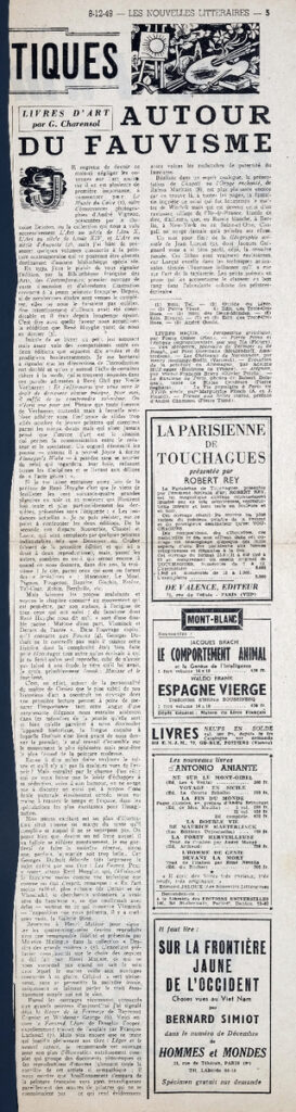 Απόκομμα της εφημερίδας “Les Nouvelles Littéraires”, έντυπο, στα γαλλικά, χαρτί, διπλής όψης, 60×14,5 εκ., όπου δημοσιεύεται άρθρο του Γάλλου κριτικού G. Charensol, σχετικά με το καλλιτεχνικό ρεύμα του Φωβισμού.