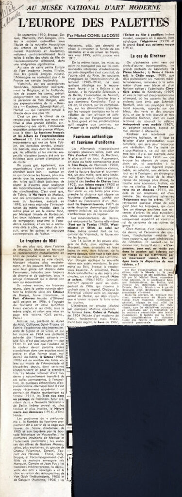 Απόκομμα της εφημερίδας “Le Monde”, έντυπο, στα γαλλικά, χαρτί, διπλής όψης, 47×17 εκ., όπου δημοσιεύεται άρθρο του κριτικού τέχνης M. Conil-Lacoste. Πάνω αριστερά, επιγραφή με τα στοιχεία έκδοσης.