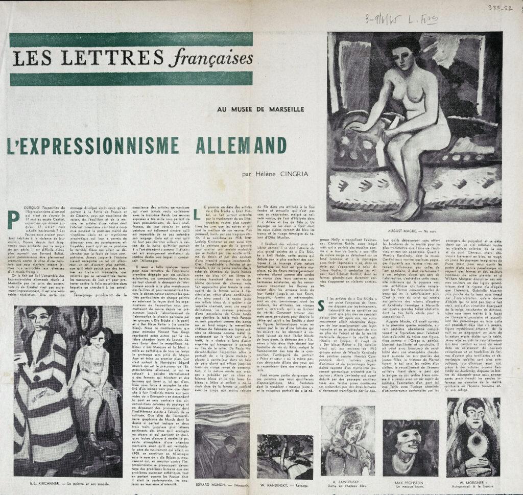 Απόκομμα της εφημερίδας “Les Lettres Françaises”, 03-09/06/1965, έντυπο, στα γαλλικά, χαρτί, διπλής όψης, 39×42,5 εκ., όπου δημοσιεύεται άρθρο της κριτικού H. Cingria, σχετικά με τον γερμανικό εξπρεσιονισμό. Το απόσπασμα εικονογραφείται. Πάνω δεξιά, επιγραφή με τα στοιχεία έκδοσης.