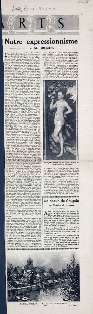 Απόκομμα του περιοδικού “Arts”, έντυπο, στα γαλλικά, χαρτί, διπλής όψης, 56,5×15,5 εκ., όπου δημοσιεύεται άρθρο του Γάλλου ιστορικού και κριτικού τέχνης G. Diehl, σχετικά με το καλλιτεχνικό κίνημα του εξπρεσιονισμού. Το απόσπασμα εικονογραφείται. Πάνω από τον τίτλο, επιγραφή με τα στοιχεία έκδοσης.