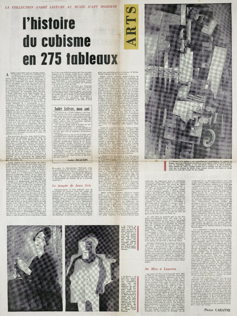 Απόκομμα του περιοδικού “Arts”, 11-17/03/1964, έντυπο, στα γαλλικά, χαρτί, διπλής όψης, 59,5×42 εκ., όπου δημοσιεύεται άρθρο του δημοσιογράφου P. Cabanne, σχετικά με την έκθεση έργων κυβισμού από την συλλογή André Lefèvre, στο Εθνικό Μουσείο Μοντέρνας Τέχνης της Γαλλίας. Το απόσπασμα εικονογραφείται. Πάνω από τον τίτλο, επιγραφή με τα στοιχεία έκδοσης.