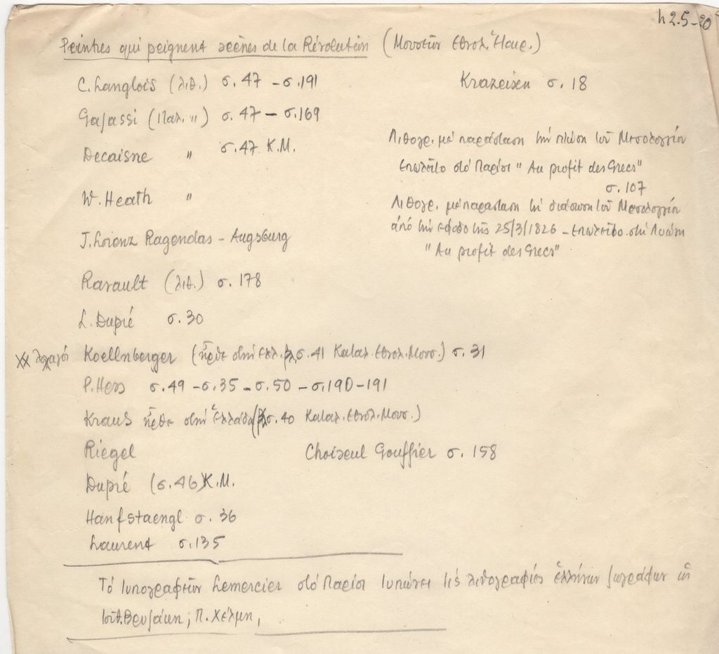 Απόκομμα χαρτιού, 19 x 21,5 εκ., με χειρόγραφες με μολύβι σημειώσεις του Τώνη Σπητέρη στα γαλλικά και ελληνικά. Αναγράφεται λίστα καλλιτεχνών που ζωγράφισαν σκηνές από την Ελληνική Επανάσταση, με παραπομπές σε σελίδες καταλόγου του Μουσείου Εθνολογικής Εταιρείας.