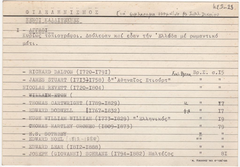 Καρτέλες αποδελτίωσης, 3 φφ, 13,5 x 19,5 εκ., με δακτυλόγραφη και χειρόγραφη λίστα του Τώνη Σπητέρη, στα ελληνικά, αγγλικά, γαλλικά και γερμανικά, στην οποία αναγράφονται φιλέλληνες καλλιτέχνες. Αναγράφονται τα ονόματα των: Dalton, Stuart, Revett, Cartwright, Dodwell, Williams, Cromec, Sothbey, Noel, Lear, Schranz, Haygarth, Purser, Friedel, Voutier, Leblanc, Devéria, Doussaut, Decamps, Dupré, Delacroix, Ravault, Gericault, Langlois, Vernet, Daumier, Verdiot, Schlessinger, Campe, Scherer, Hess, Rothman, Κράσου, Κελμπέργκερ, Στάκλμπεργκ.