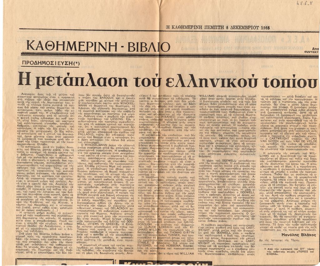 Απόκομμα, χαρτί, 27 x 32 εκ., στα ελληνικά, δημοσίευσης κειμένου το οποίο αναφέρεται σε έργα με θέμα το ελληνικό τοπίο. Πρόκειται για προδημοσίευση τμήματος έκδοσης με τίτλο “Τόπος και Εικόνα”.