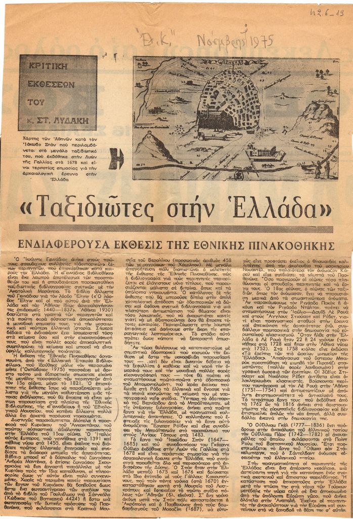 Απόκομμα, χαρτί, 30 x 21 εκ., στα ελληνικά, δημοσίευσης κριτικής έκθεσης η οποία διεξάγεται στην Εθνική Πινακοθήκη Αθηνών σε συνεργασία με την Εταιρεία Βιβλιοφίλων, με θέμα την περιήγηση στην Ελλάδα κατά τα προεπαναστατικά χρόνια. Εντάσσεται στη στήλη “Κριτική εκθέσεων του Στ. Λυδάκη”.