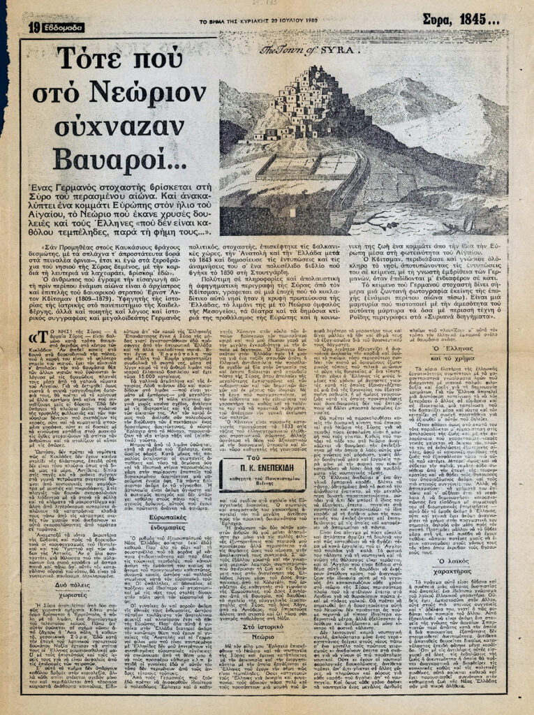 Απόκομμα της εφημερίδας “Το Βήμα” (20/07/1980), όπου δημοσιεύεται άρθρο με θέμα τις εντυπώσεις του Βαυαρού περιηγητή Ernst Anton Quitzmann κατά την επίσκεψή του στην Σύρο το 1845.