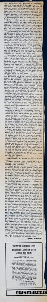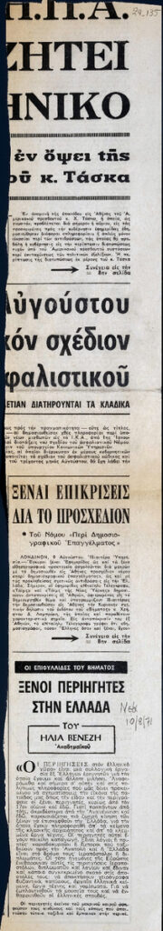 Απόκομμα της εφημερίδας “Τα Νέα” (10/08/1971), όπου δημοσιεύεται κείμενο του Ηλία Βενέζη.