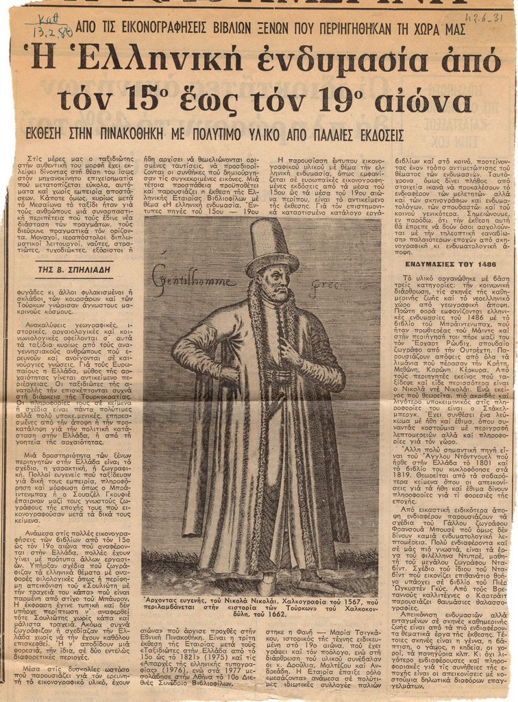 Απόκομμα, χαρτί, 29 x 21 εκ., στα ελληνικά, δημοσίευσης κριτικής έκθεσης με θέμα την ελληνική ενδυμασία, η οποία διεξάγεται στην Εθνική Πινακοθήκη Αθηνών. Δίνονται πληροφορίες και σχόλια για την έκθεση.