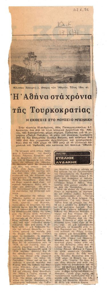 Απόκομμα, χαρτί, 33 x 10 εκ., στα ελληνικά, δημοσίευσης κριτικής έκθεσης με θέμα την Αθήνα στην περίοδο της Τουρκοκρατίας, η οποία διεξάγεται στο Μουσείο Μπενάκη. Δίνονται πληροφορίες για τα εκθέματα ενώ σημειώνεται πως όσα παρουσιάζονται στην έκθεση θα αποτελέσουν εκθέματα του μουσείου της πόλης των Αθηνών, που τελεί υπό κατασκευή.