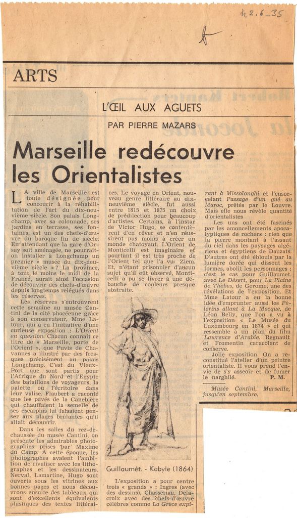Απόκομμα, χαρτί ακανόνιστου μεγέθους, στα γαλλικά, δημοσίευσης κριτικής έκθεσης με θέμα την Ανατολή, η οποία διεξάγεται στην Μασσαλία. Στην έκθεση προβάλλονται τεκμήρια, έργα καλλιτεχνών ή φωτογραφίες, αναμνήσεις περιηγητών.