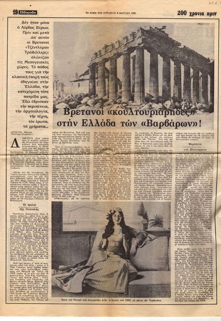 Απόκομμα, χαρτί, 43 x 31 εκ., στα ελληνικά, δημοσίευσης άρθρου το οποίο αναφέρεται στους Βρετανούς περιηγητές στην Ελλάδα της μετεπαναστατικής περιόδου.