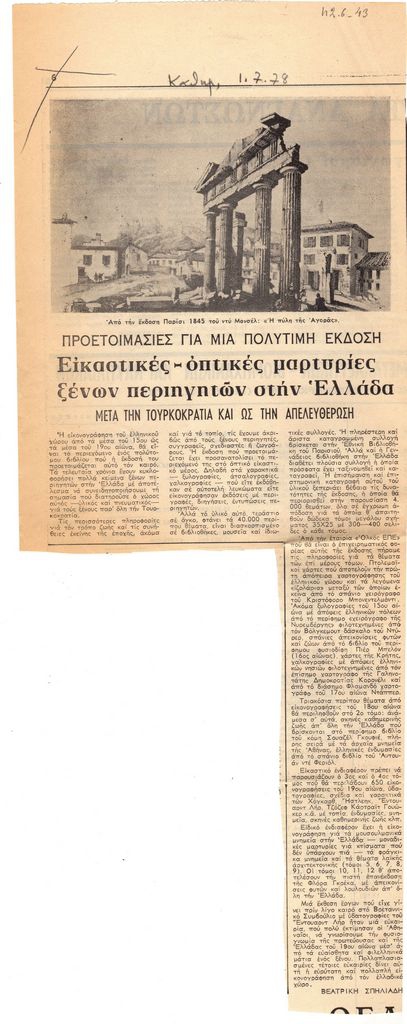 Απόκομμα, χαρτί ακανόνιστου μεγέθους, στα ελληνικά, δημοσίευσης άρθρου το οποίο αναφέρεται σε κυκλοφορία έκδοσης με θέμα την εικονογράφηση του ελλαδικού χώρου της περιόδου 15ου-19ου αιώνα, μέσα αολι τη ματιά των περιηγητών της εποχής. Δίνονται πληροφορίες.