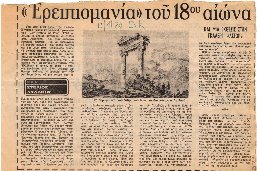 Απόκομμα, χαρτί, 18 x 26,5 εκ., στα ελληνικά, δημοσίευσης άρθρου το οποίο αναφέρεται στην ‘ερειπιομανία’. Σχολιάζεται η έκδοση βιβλίου του αρχιτέκτονα Jean David Le Roy, ύστερα από επίσκεψή του στην Ακρόπολη τον 18ο αιώνα και η γενικότερη τάση της εποχής στο πλαίσιο του ρομαντισμού, επίσκεψης σε χώρους αρχαιολογικού ενδιαφέροντος. Στο ίδιο, αναφορά σε έκθεση της Ρένας Ανούση στην γκαλερί Άστορ. Εντάσσεται στη στήλη “Εικαστικά” του εντύπου.