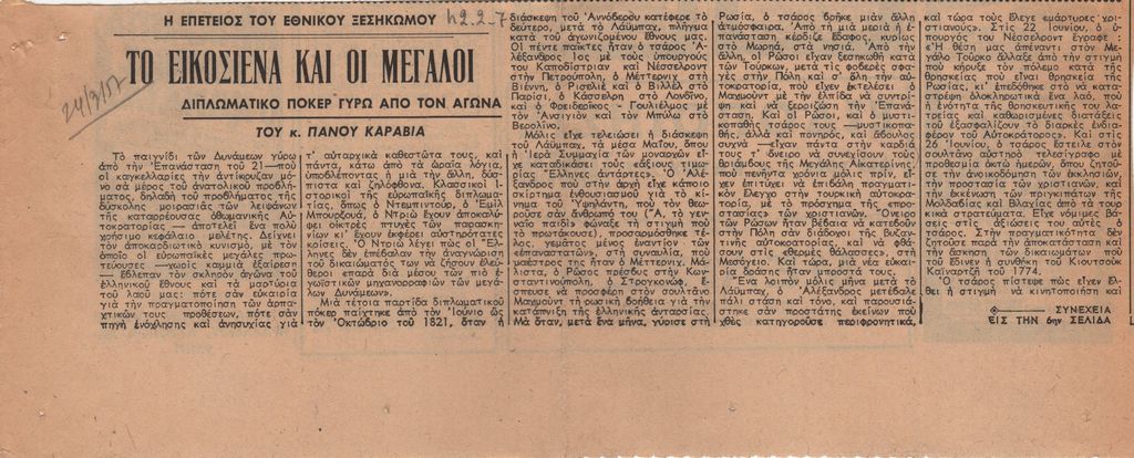 Απόκομμα, χαρτί, 2 φφ, 11 x 26,5 και 36 x 10 εκ., στα ελληνικά, δημοσίευσης άρθρου το οποίο αναφέρεται στον ρόλο των Μεγάλων Δυνάμεων, τις διπλωματικές κινήσεις τους και τα αποτελέσματά τους ως προς την Ελληνική Επανάσταση. Φέρει χειρόγραφη σημείωση.