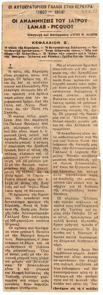 Απόκομμα, χαρτί, 29 x 10 και 7x 5 εκ., στα ελληνικά, δημοσίευσης κειμένου το οποίο μεταφέρει αναμνήσεις του ιατρού και περιηγητή Lamare Picquot από την Κέρκυρα των αρχών του 19ου αι. όπου έζησε. Στο συγκεκριμένο αναφέρεται στην πόλη της Κέρκυρας.