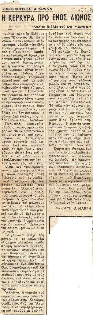 Απόκομμα, χαρτί ακανόνιστου μεγέθους, στα ελληνικά, δημοσίευσης μετάφρασης τμήματος κειμένου του De Ferrer στο οποίο μεταφέρονται εντυπώσεις από την Κέρκυρα όπου ταξίδεψε.