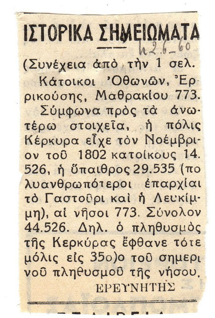 Απόκομμα, χαρτί, 2 φφ ακανόνιστου μεγέθους, στα ελληνικά, στο οποίο αναγράφονται πληροφορίες για τον αριθμό κατοίκων χωριών της Κέρκυρας στις απαρχές του 19ου αιώνα.