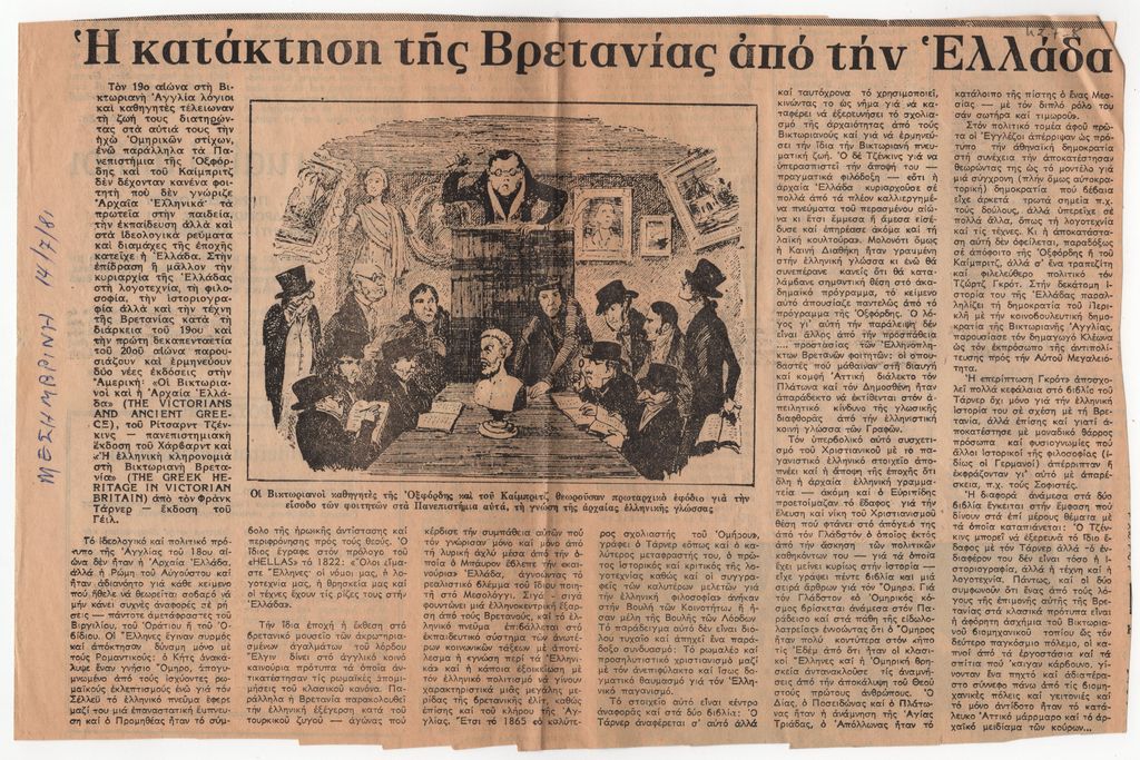 Απόκομμα, χαρτί, 21 x 32 εκ., στα ελληνικά, δημοσίευσης βιβλιοκριτικής. Σχολιάζονται δύο εκδόσεις, “Οι Βικτωριανοί και η Αρχαία Ελλάδα” και “Η ελληνική κληρονομιά στην Βικτωριανή Βρετανία”, σχετικά με την αγάπη και την ενασχόληση των Βρετανών με την ελληνική κλασσική φιλολογία.