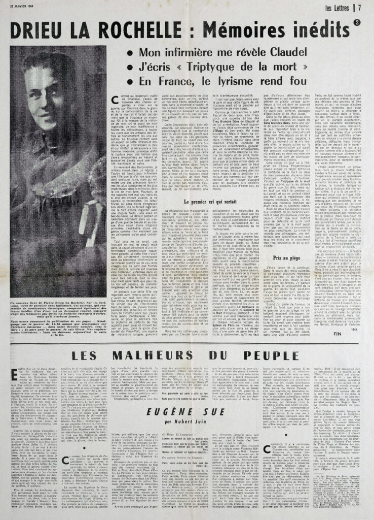 Απόκομμα του περιοδικού “L’ Oeil”, έντυπο, στα γαλλικά, χαρτί, διπλής όψης, 60×42,5 εκ. Το απόσπασμα εικονογραφείται. Στο ίδιο απόκομμα: “Drieu La Rochelle: mémoires inédits”.