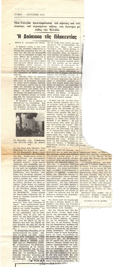 Απόκομμα, χαρτί ακανόνιστου μεγέθους, στα ελληνικά, δημοσίευσης κειμένου το οποίο αναφέρεται στην Δούκισσα της Πλακεντίας, γαλλίδας αριστοκράτισσας που αγάπησε την Ελλάδα.