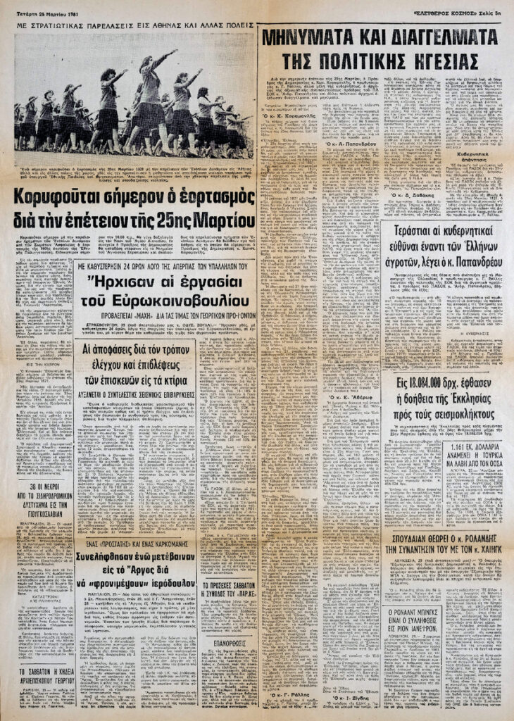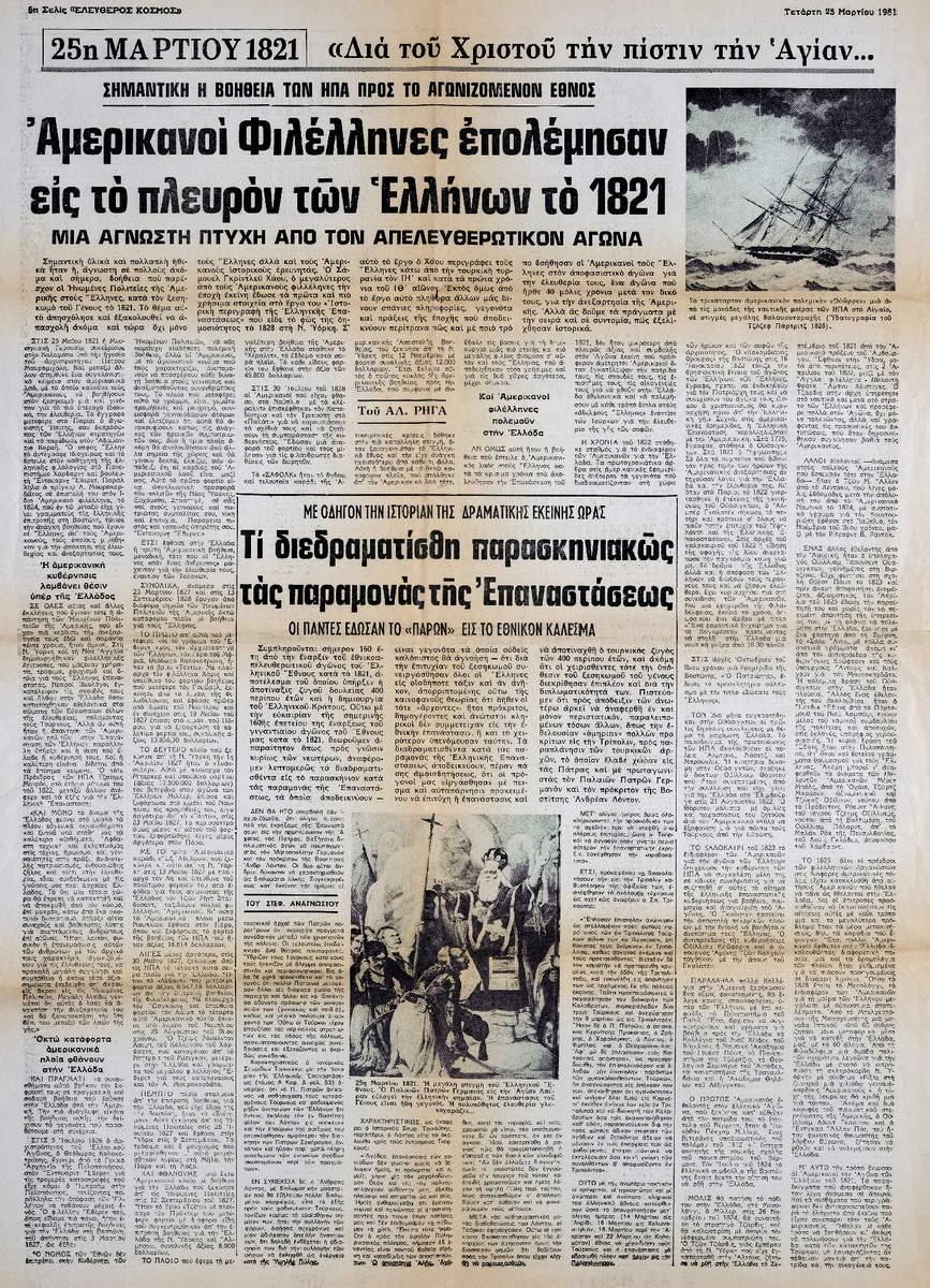 Απόκομμα της εφημερίδας “Ελεύθερος Κόσμος” (25/03/1981), όπου δημοσιεύεται άρθρο με θέμα τη συμβολή Αμερικάνων Φιλελλήνων στον Αγώνα.