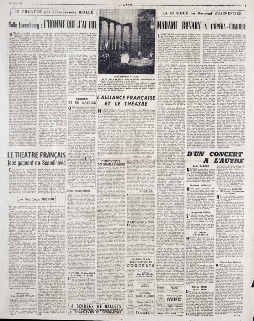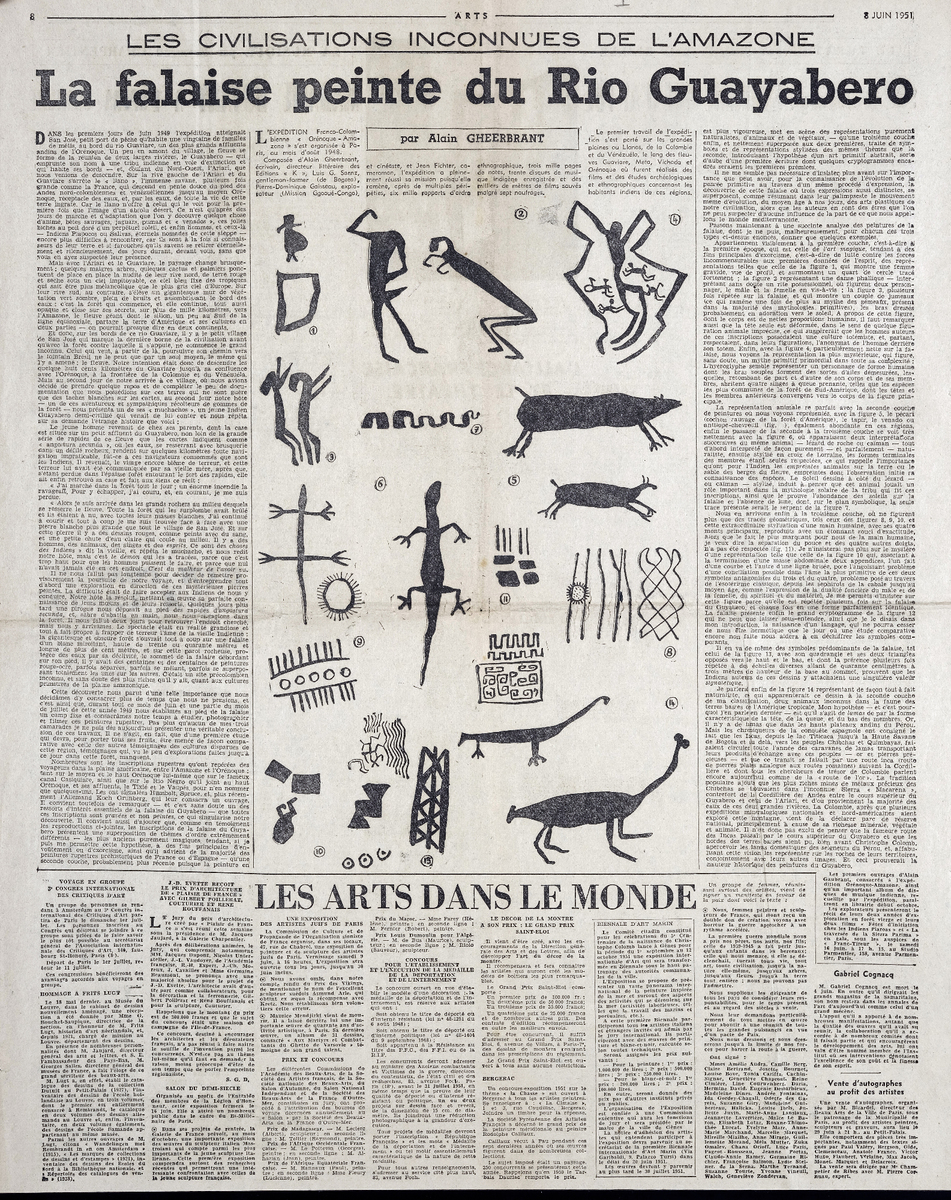 Απόκομμα του περιοδικού “Arts”, έντυπο, στα γαλλικά, χαρτί, διπλής όψης, 56×43,5 εκ., όπου δημοσιεύεται άρθρο για προϊστορικές ζωγραφικές παραστάσεις πάνω σε φυσικό πέτρωμα κοντά στον ποταμό Rio Guayabero στην Κολομβία. Το απόσπασμα εικονογραφείται.