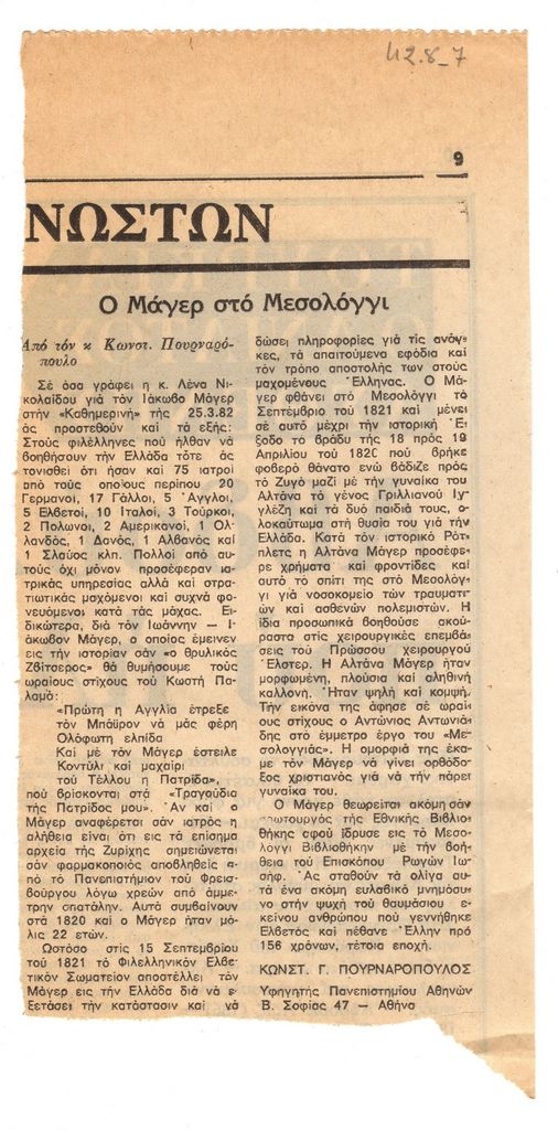 Απόκομμα, χαρτί, 22×11 εκ., στα ελληνικά, δημοσίευσης κειμένου το οποίο αναφέρεται στον Ιωάννη Ιάκωβο Μάγερ και το φιλελληνικό του έργο.