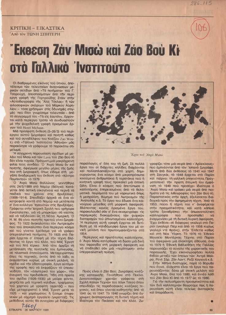 Απόκομμα, έντυπο, χαρτί, 29,0×21,5 εκ., όπου δημοσιεύεται, στα ελληνικά, άρθρο του Τώνη Σπητέρη για την έκθεση σχεδίων του Herni Michaux και του Κινέζου Zo Wou-Ki, που πραγματοποιήθηκε στην Αθήνα το 1981. Κάτω αριστερά, επιγραφή. Στο ίδιο απόκομμα: Τάκης Μενδράκος «Ελεγεία για μία πόλη. Παλιές καρτ-ποστάλ ζωντανεύουν μία Θεσσαλονίκη που δεν υπάρχει πια».