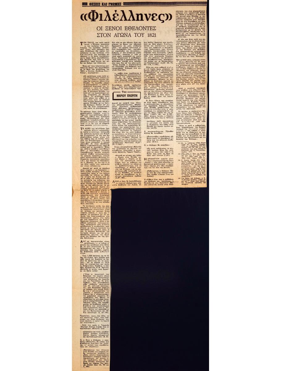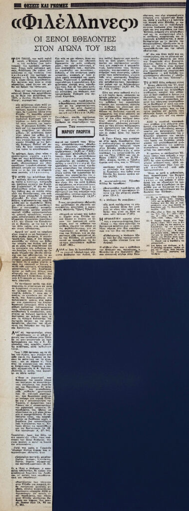 Απόκομμα της εφημερίδας “Το Βήμα” (22/03/1981), όπου δημοσιεύεται άρθρο με θέμα τους Φιλέλληνες που συνέβαλλαν καθοριστικά στον Αγώνα για την απελευθέρωση των Ελλήνων.