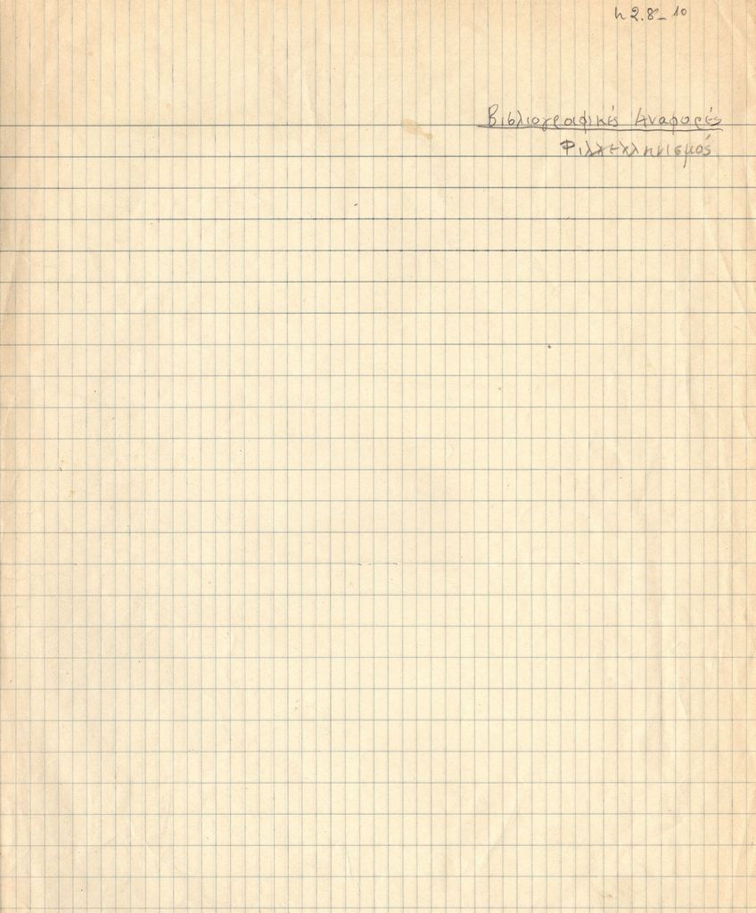 Χαρτί, 5 φφ, 30 x 21 εκ., με χειρόγραφες σημειώσεις, μολύβι στα ελληνικά, σε πίνακα, του Τώνη Σπητέρη. Περιέχει βιβλιογραφικές αναφορές για τον Φιλελληνισμό, σε έντυπα. Αναγράφονται θεματικές, ονόματα φιλελλήλων και τίτλοι εντύπων.