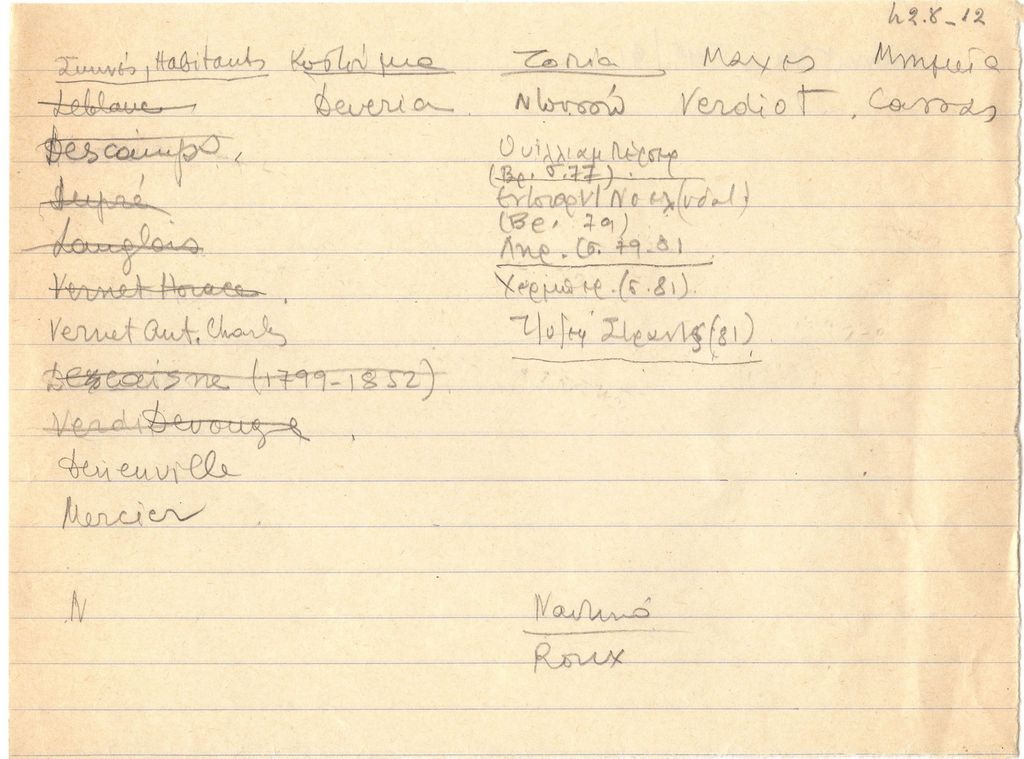 Απόκομμα χαρτιού, 15 x 20 εκ., με χειρόγραφες σημειώσεις του Τώνη Σπητέρη, με μολύβι στα ελληνικά και γαλλικά. Περιέχει λίστες με ονόματα καλλιτεχνών που φιλοτέχνησαν σκηνές, μάχες, τοπία, μνημεία με θέμα την Ελληνική Επανάσταση.