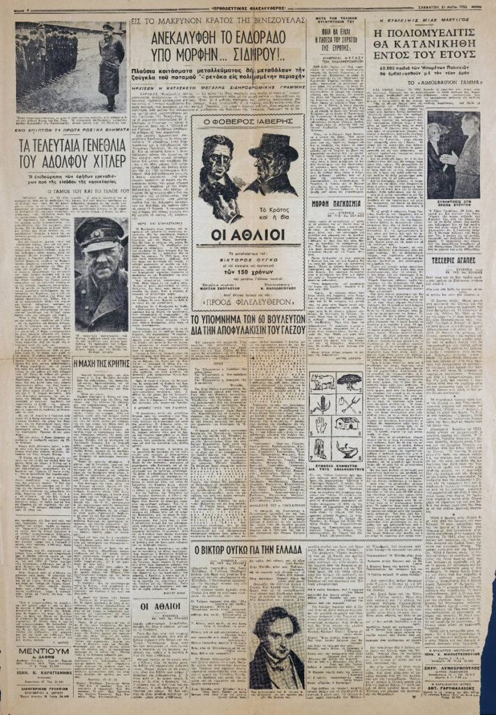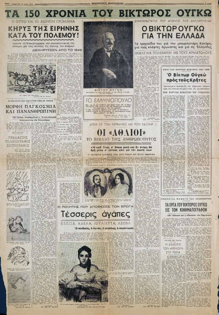 Απόκομμα της εφημερίδας “Προοδευτικός Φιλελεύθερος” (31/05/1952), δημοσίευσης κειμένου το οποίο αναφέρεται στον Victor Hugo και την συνεχή του προσπάθεια για την θεμελίωση της ειρήνης. Δημοσιεύτηκε στο πλαίσιο αφιερώματος του εντύπου για τα 150 χρόνια από την γέννησή του.