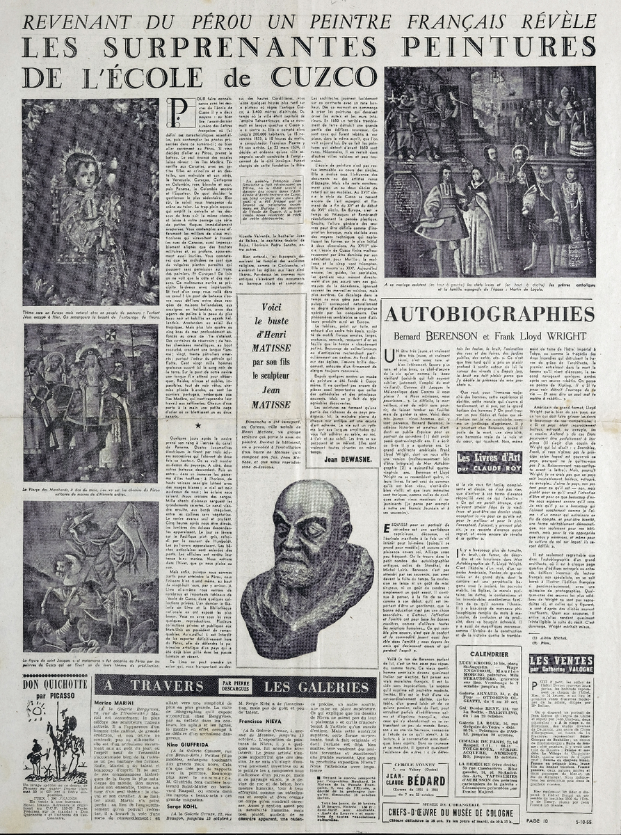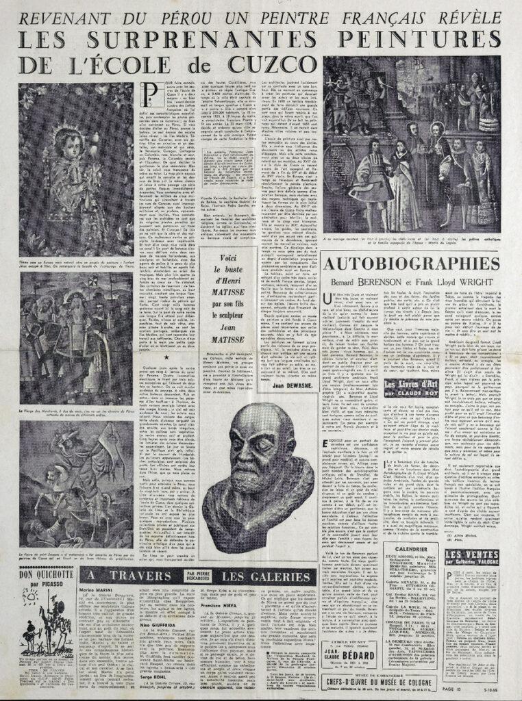 Απόκομμα της εφημερίδας “Les Lettres Françaises”, 06-12/10/1955, έντυπο, στα γαλλικά, χαρτί, διπλής όψης, 60×42,5 εκ., όπου δημοσιεύεται άρθρο του εικαστικύ J. Dewasne. Το απόσπασμα εικονογραφείται. Πάνω από τον τίτλο, επιγραφή με στοιχεία έκδοσης. Στο ίδιο απόκομμα: Claude Roi “Autobiographies Bernard Berenson et Frank Lloyd Wright’.