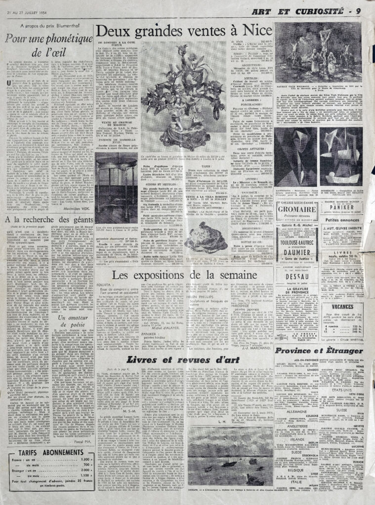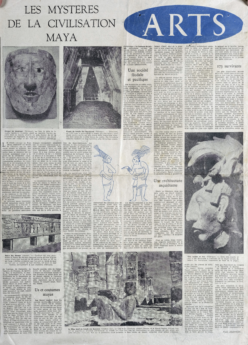 Απόκομμα του περιοδικού “Arts”, 21-27/07/1954, έντυπο, στα γαλλικά, χαρτί, διπλής όψης, 59×42,5 εκ., όπου δημοσιεύεται άρθρο για τον πολιτισμό των Μάγια. Το απόσπασμα εικονογραφείται.