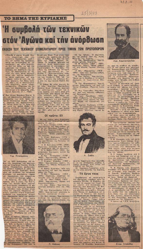 Απόκομμα, χαρτί, 36 x 20 εκ., στα ελληνικά, δημοσίευσης άρθρου το οποίο αναφέρεται στον ρόλο που έπαιξαν οι επιστήμονες της εποχής στον Αγώνα και στην ανόρθωση του μετέπειτα ελληνικού κράτους. Ειδικότερα, αναγράφονται οι Κ. Κάλφας, Μ. Κοκκίνης, Σ. Βούλγαρης, Θ. Βαλλιάνος, Λ. Ζαβός, Γ. ΠΙτσαμάνος, Σ. Κλεάνθης, Ε. Σμυρναίος, Π. Παπαναούμ, Ι. Μ. Γεδεών, Δ. Ζέζος, Λ. Καυταντόγλου, Α. Λύτρας, Ι. Λάτρης, Π. Παπαδόπουλος, Θ. Κομηνός, Φ. Μαργαρίτης, Π. Κάλκας, Τ. Βλασσόπουλος, Μ. Γεωργιάδης, Ι. Παπαδάκης, Μ. Χαρβούρης, Ι. Γρογορίνης.