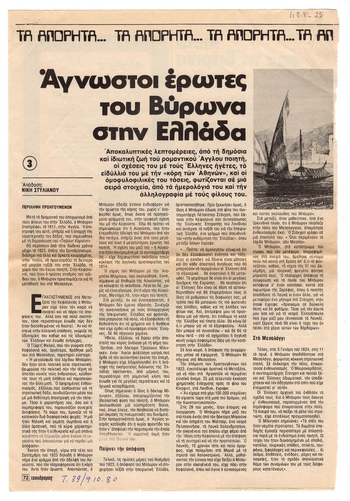 Απόκομμα, χαρτί, 2 φύλλα, 32×22,5 εκ., στα ελληνικά, δημοσίευσης κειμένου το οποίο αναφέρεται στη ζωή του Λόρδου Βύρωνα κατά την δεύτερη εγκατάστασή του στην Ελλάδα την περίοδο της Ελληνικής Επανάστασης. Δίνονται λεπτομέρειες για την ιδιωτική του ζωή, μέσα από δική του αλληλογραφία και ημερολόγια.