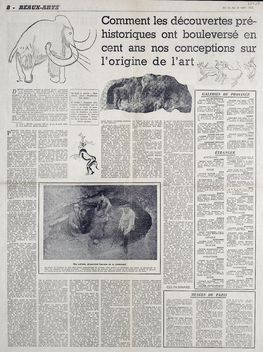Απόκομμα του περιοδικού “Arts”, 23-29/11/1955, έντυπο, στα γαλλικά, χαρτί, διπλής όψης, 59×42,5 εκ., όπου δημοσιεύεται άρθρο για το γεγονός ότι οι προϊστορικές ανακαλύψεις άλλαξαν τις απόψεις των ειδικών για την προέλευση της τέχνης. Το απόσπασμα εικονογραφείται.
