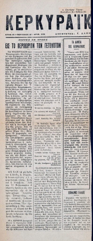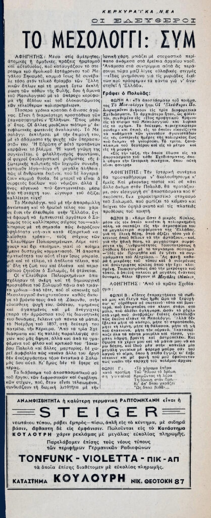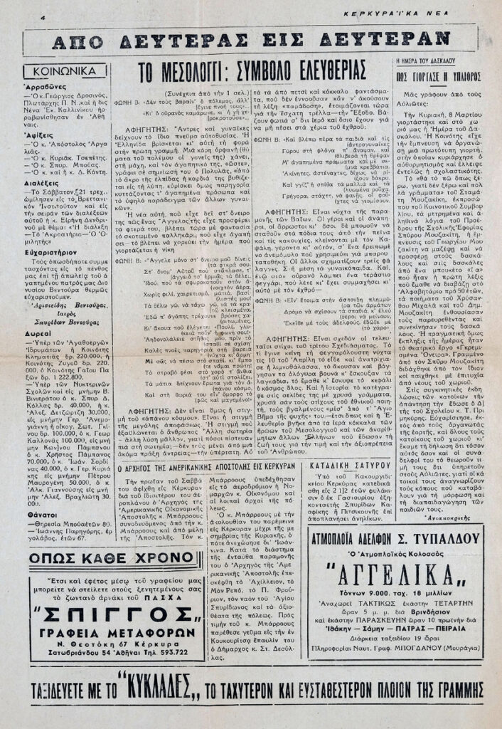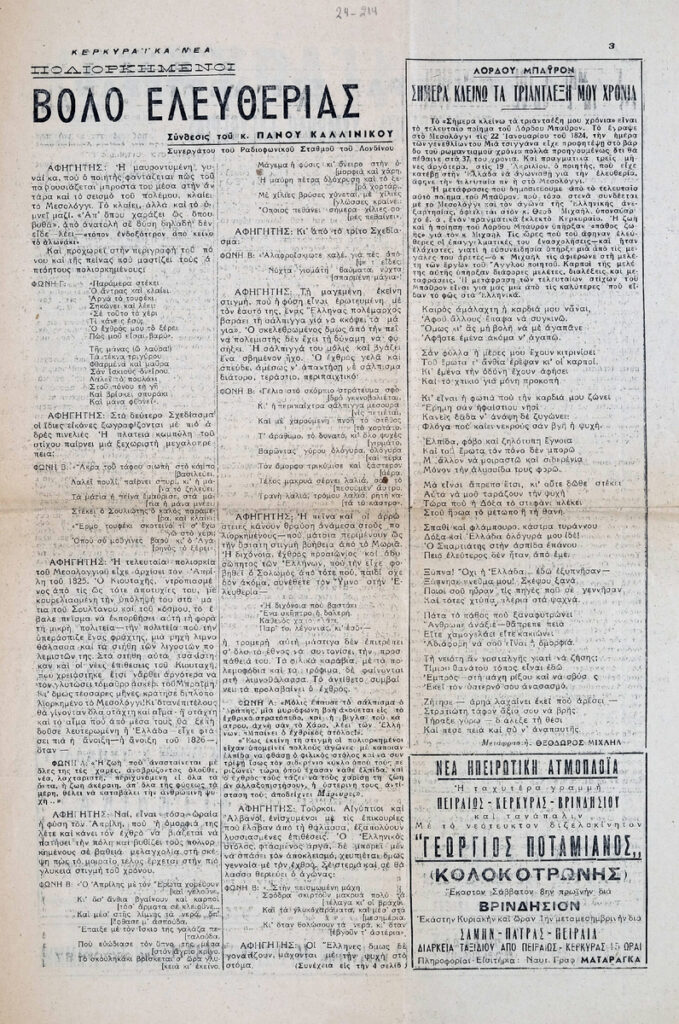 Απόκομμα της εφημερίδας “Κερκυραϊκά Νέα”, όπου δημοσιεύεται άρθρο με θέμα το Μεσολόγγι, σύμβολο ελευθερίας κατά την περίοδο της Ελληνικής Επανάστασης. Δίνονται αποσπάσματα από τους “Ελεύθερους Πολιορκημένους” του Δ. Σολωμού. Στο ίδιο, μετάφραση κειμένου του Λόρδου Μπάυρον “Σήμερα κλείνω τα τριαντα έξη μου χρόνια”, που θεωρείται συχνά το τελευταίο ποίημά του.