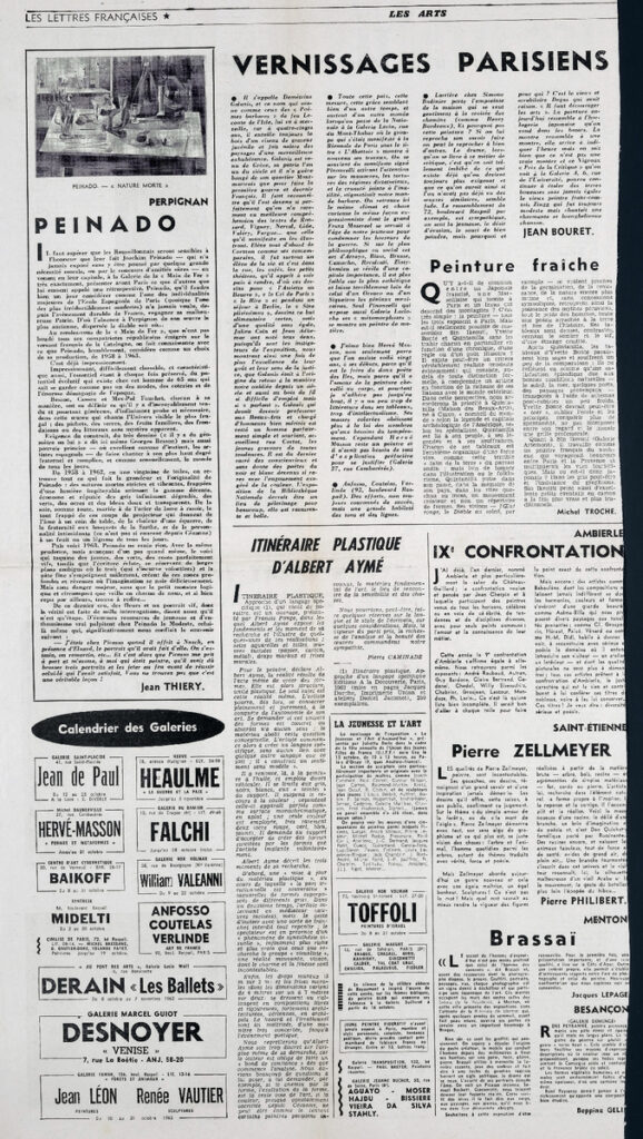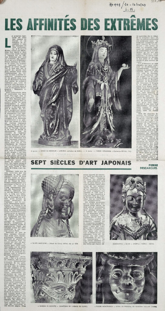 Απόκομμα της εφημερίδας “Les Lettres Françaises”, 10-16/10/1963, έντυπο, στα γαλλικά, χαρτί, διπλής όψης, 60×31 εκ., όπου δημοσιεύεται άρθρο για την ιαπωνική τέχνη. Το απόσπασμα εικονογραφείται. Πάνω από τον τίτλο, επιγραφή με τα στοιχεία έκδοσης.