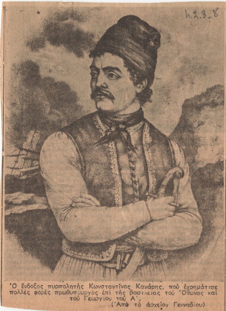 Απόκομμα εντύπου, χαρτί, 12,5 x 9 εκ., με α/μ αναπαραγωγή έργου με εικονιζόμενο τον Κωνσταντίνο Κανάρη. Σημειώνεται πως το έργο προέρχεται από το αρχείο Γενναδίου.