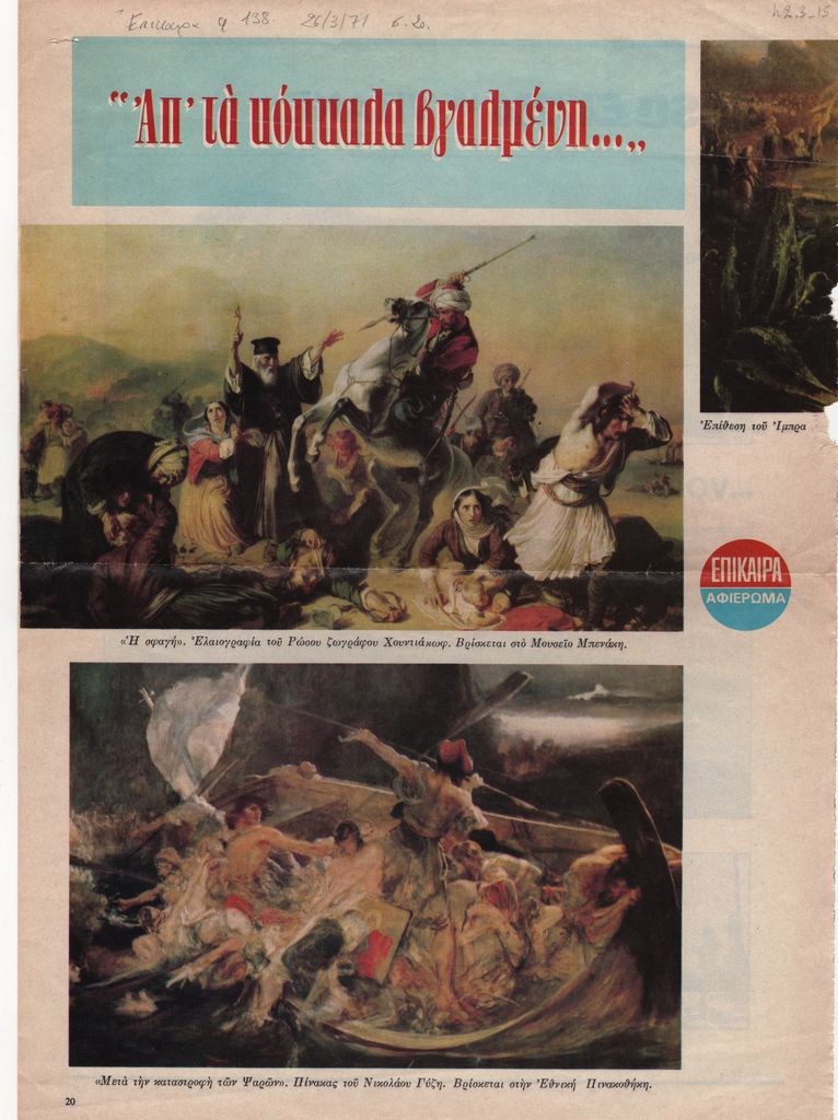 Απόκομμα, χαρτί, 2 φφ, 33,5 x 24,5 εκ., στα ελληνικά, δημοσίευσης άρθρου το οποίο αναφέρεται στην Ελληνική Επανάσταση. Το απόκομμα εικονογραφείται και φέρει χειρόγραφη σημείωση.