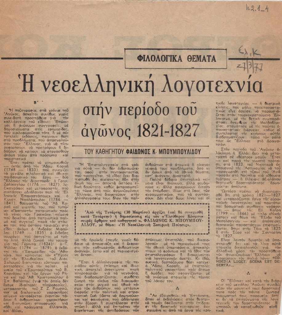 Απόκομμα, χαρτί, 23×21 εκ., στα ελληνικά, δημοσίευσης άρθρου το οποίο αναφέρεται στην λογοτεχνία την περίοδο της Ελληνικής Επανάστασης (1821-1827). Αναγράφονται ονόματα ορισμένων από τους σημαντικότερους εκπροσώπους της περιόδου ενώ δίνονται πληροφορίες για την επιστολογραφία και τη θεατρική παραγωγή. Εντάσσεται στη στήλη “Φιλολογικά Θέματα” του εντύπου.
