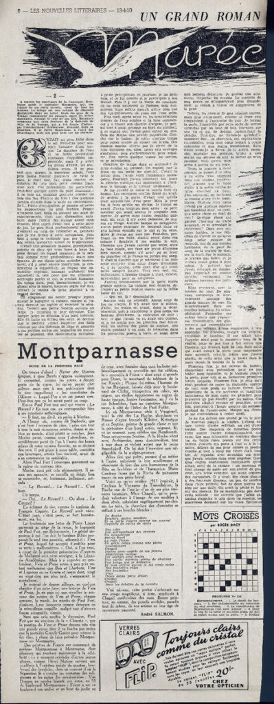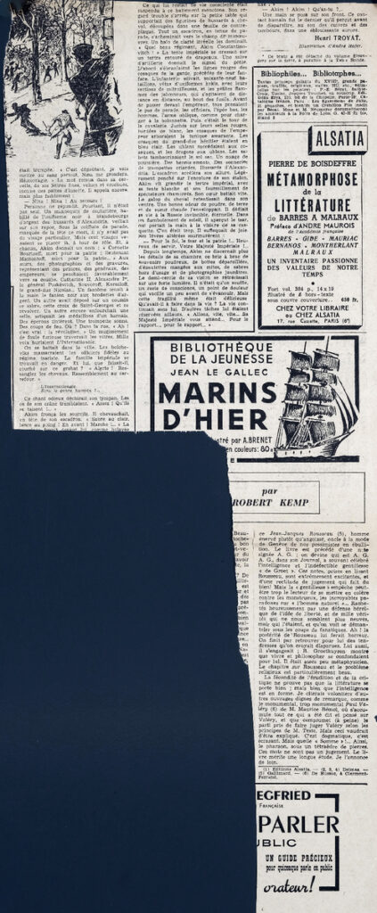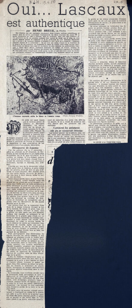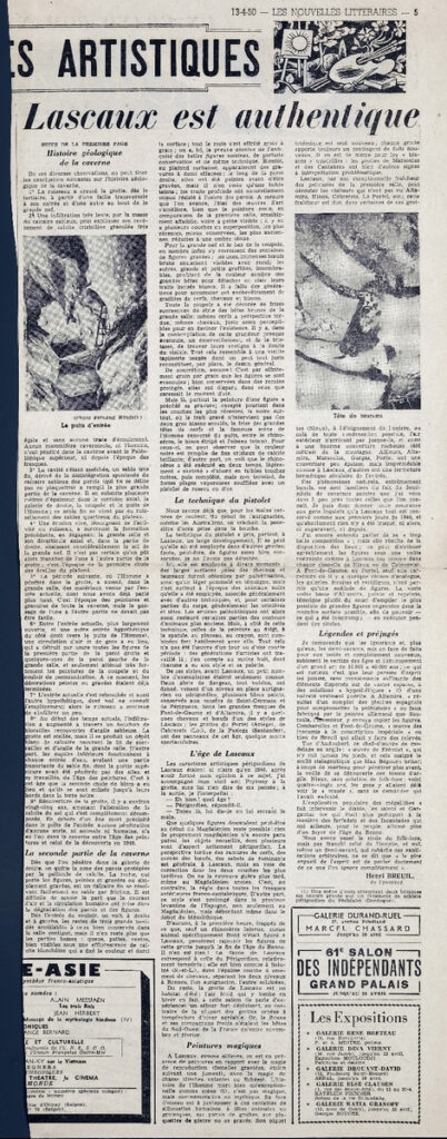 Απόκομμα της εφημερίδας “Les Nouvelles Littéraires”, έντυπο, στα γαλλικά, χαρτί, δύο τμήματα διπλής όψης: 52×21 εκ. και 60×22 εκ., όπου δημοσιεύεται άρθρο για το σπήλαιο Lascaux στην Γαλλία. Το απόσπασμα εικονογραφείται. Πάνω από τον τίτλο, επιγραφή με τα στοιχεία έκδοσης.