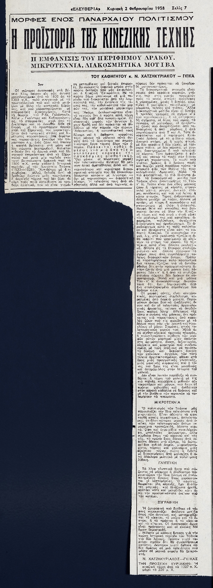 Απόκομμα της εφημερίδας “Ελευθερία”, έντυπο, στα ελληνικά, χαρτί, διπλής όψης, 46,5×17 εκ., όπου δημοσιεύεται άρθρο του εικαστικού και ακαδημαϊκού Ν. Χατζηκυριάκου-Γκίκα. Το απόσπασμα εικονογραφείται.