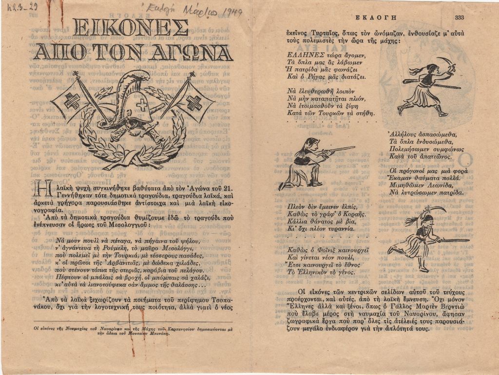 Απόκομμα, χαρτί αναδιπλωμένο, 19,5 x 13 εκ., στα ελληνικά, δημοσίευσης κειμένου αναφερόμενου σε τραγούδια, λαϊκά ποιήματα της περιόδου της Ελληνικής Επανάστασης.
