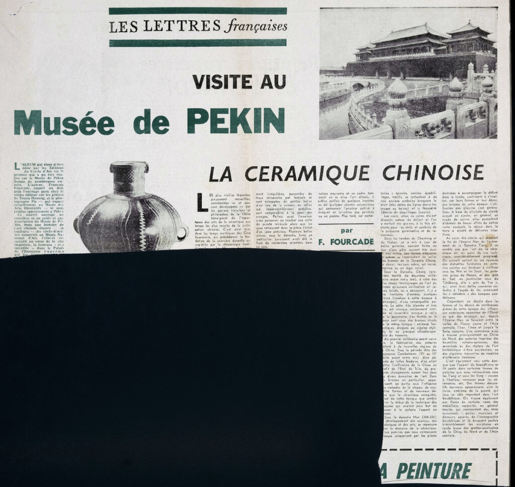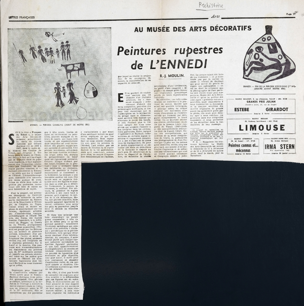 Απόκομμα της εφημερίδας “Les Lettres Françaises”, έντυπο, στα γαλλικά, χαρτί, διπλής όψης, 41×43,5 εκ., όπου δημοσιεύεται άρθρο σχετικά με την έκθεση σπηλαιογραφιών από το Ennedi της Κεντρικής Αφρικής, στο Μουσείο Διακοσμητικών Τεχνών του Παρισιού. Το απόσπασμα εικονογραφείται. Πάνω από τον τίτλο, επιγραφή. Στο ίδιο απόκομμα: F. Fourcade “Visite au Musée du Pekin. La céramique chinoise”.