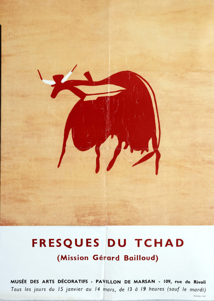 Έντυπο-αφίσα, μονόφυλλο, στα γαλλικά, χαρτί ιλλουστρασιόν, διπλής όψης, 66×49 εκ. Έντυπο για την έκθεση “Fresques du Tchad. Mission Gérard Bailloud”, που έλαβε χώρα στο Musée des Arts Décoratifs. Στην μία όψη, αφίσα. Στην πίσω όψη, ενημερωτικό κείμενο για την έκθεση.