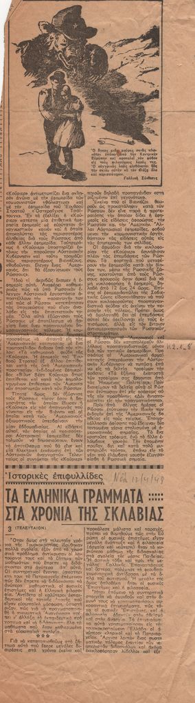 Απόκομμα, χαρτί διπλής όψης, 44 x 12.5 εκ., στα ελληνικά, δημοσίευσης άρθρου το οποίο αναφέρεται στην εκπαίδευση κατά την περίοδο της Τουρκοκρατίας στην Ελλάδα. Πρόκειται για το 3ο μέρος σειράς δημοσιεύσεων στο οποίο σχολιάζεται η διαμάχη που ξέσπασε ανάμεσα στους συντηρητικούς και προοδευτικούς δασκάλους (κληρικούς και μη) της εποχής, αναφορικά με το περιεχόμενο των μαθημάτων.