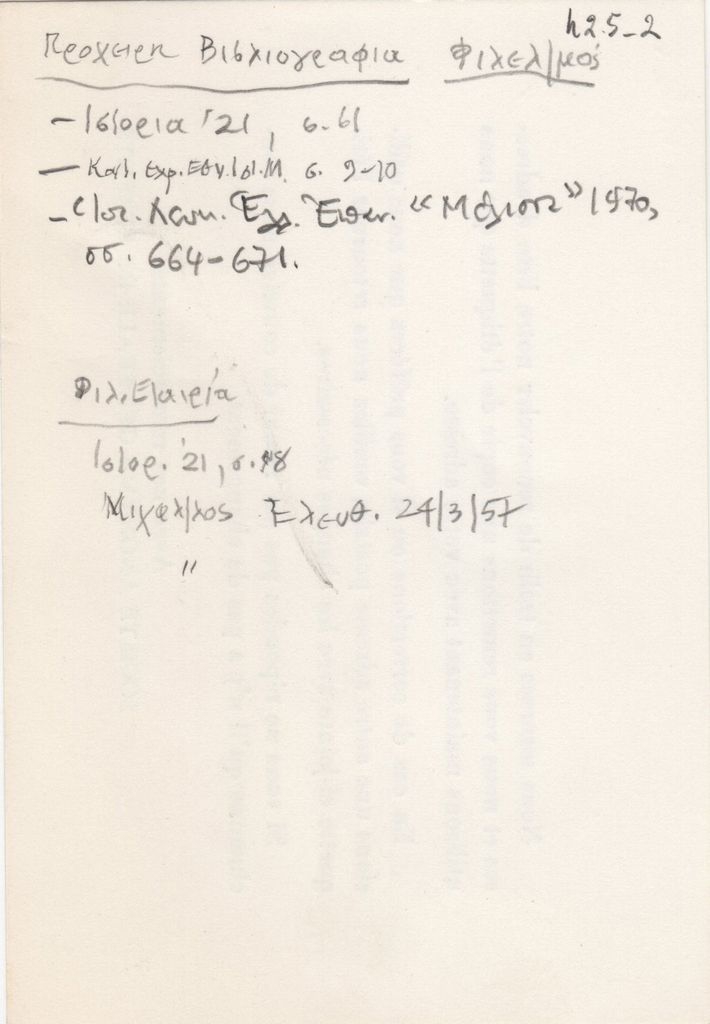 Έντυπο, χαρτόνι, 14,5 x 10 εκ., με χειρόγραφες με μολύβι στα ελληνικά σημειώσεις του Τώνη Σπητέρη. Αναγράφεται βιβλιογραφία για τον φιλλεληνισμό και την Φιλική Εταιρεία.